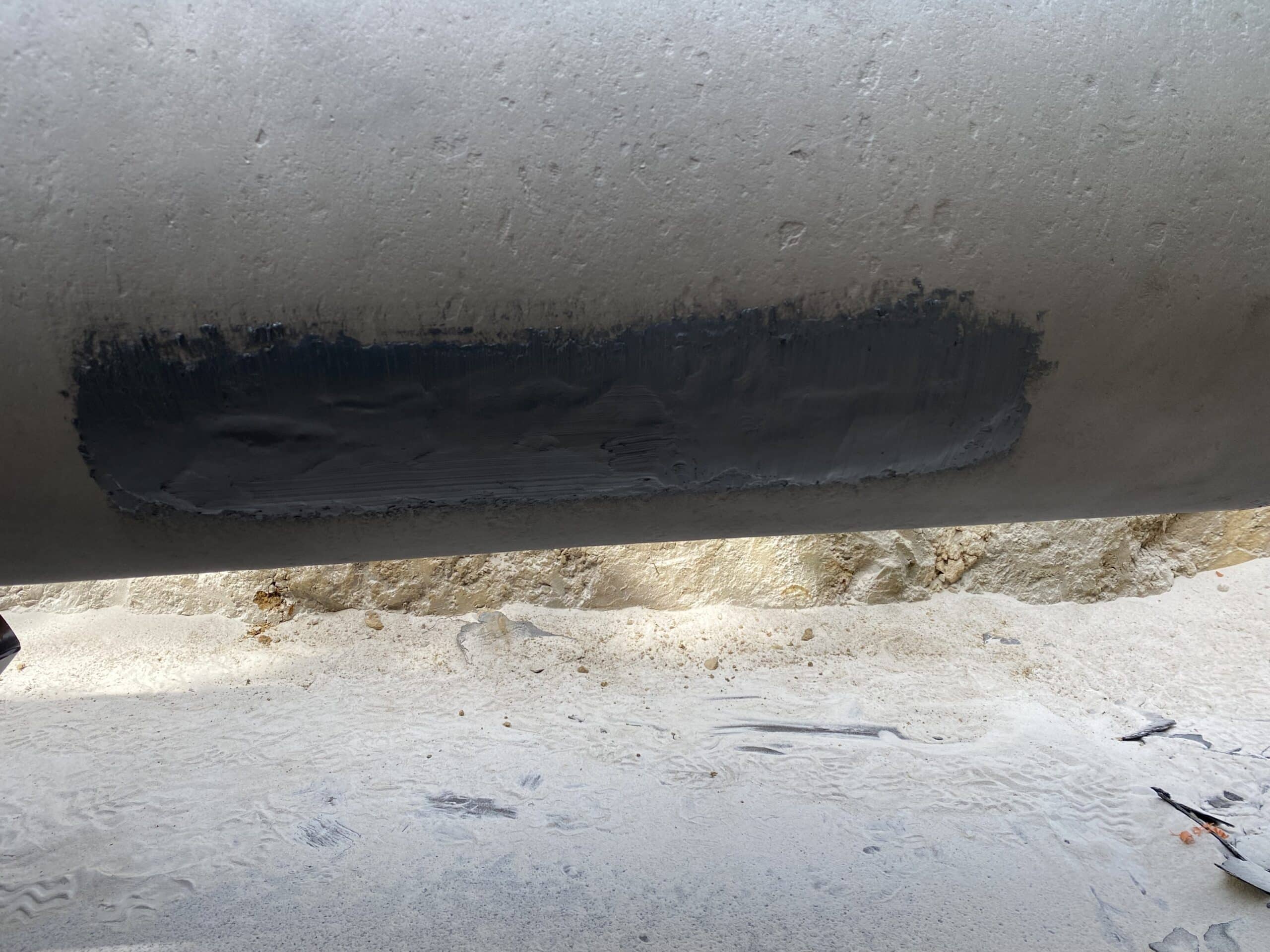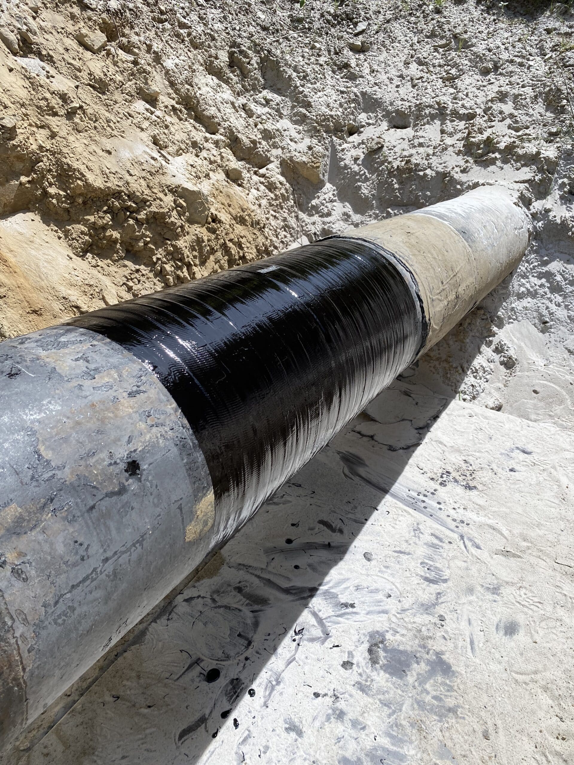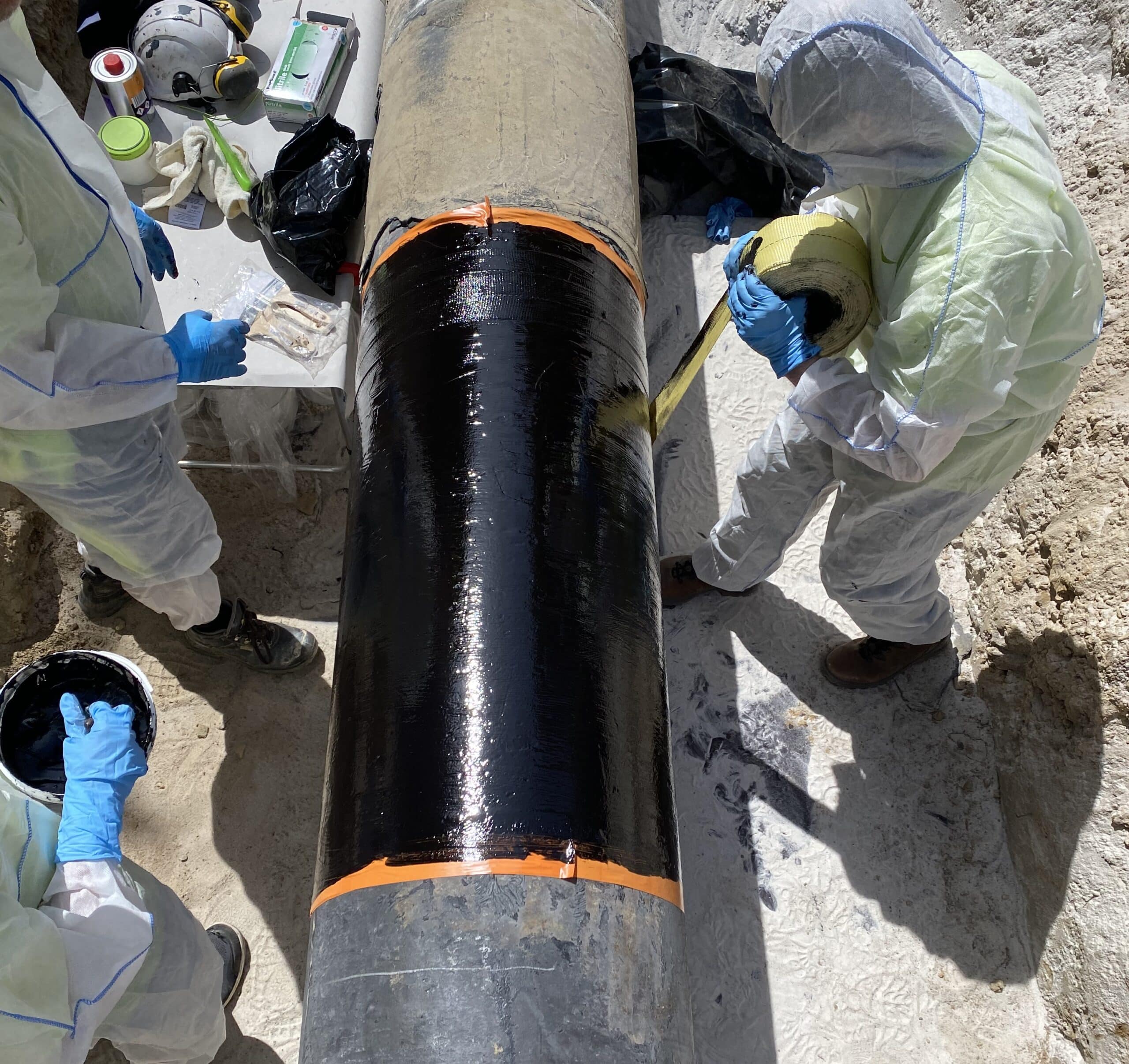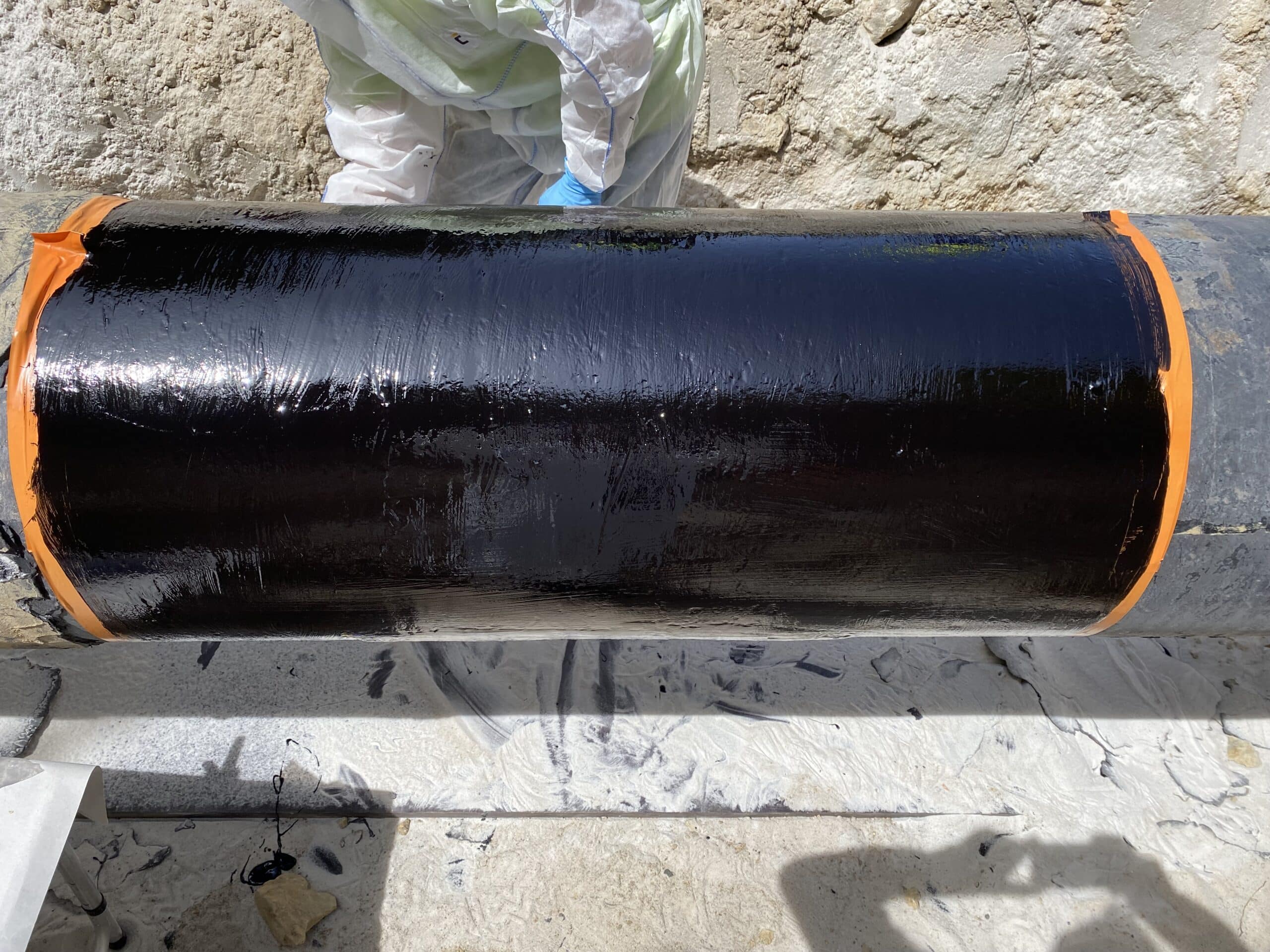 - One layer of R3X55 resin was then applied on the defected area (previously delimited) to protect the surface from corrosion and ensure a good wetting of the composite wrapping with the steel pipe.