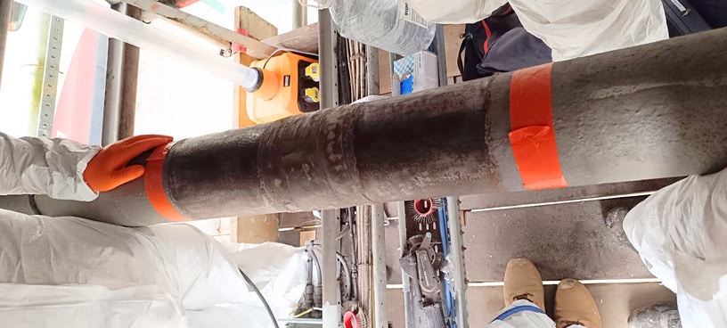 The existing repair had been recently carried out as a temporary reinforcement, without any calculations or compliance with applicable standards. The client called 3X and its partner to perform a long-term repair in full compliance with applicable standards. In accordance with ISO 24.817 standard, the repair procedure specified the application of 4 layers of R4D composite sytem (Kevlar® tape impregnated with a bi-component epoxy resin) to secure the previous repair. Hygrometry test was performed to control the humidity. Then the pipe surface was prepared using Bristle Blaster machine, achieving a cleanliness level equivalent to St3/SA 2.5 and a surface roughness of 76.2 (Rz), verified with a calibrated roughness tester. Finally, the surface was degreased with acetone prior to the composite application.