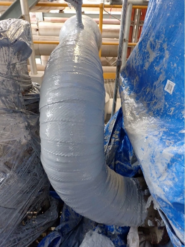 - The composite reinforcement was installed using Kevlar® tape impregnated with 3X high-temperature resin. A total of 6 layers were wrapped around the defect, covering a total repair length of 1455 mm.