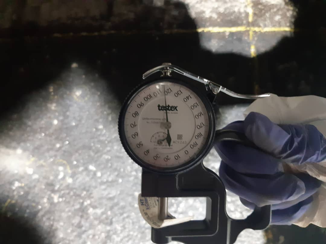 1. Step-surface preparation and cleaning: Surface preparation was performed on the damaged locations of the separator by hydroblasting. The surface profile was checked using a roughness tester to validate that roughness was acceptable and superior to 60-micron. Climatic conditions were checked before applying the resin. Patching areas were previously delimited with abrasive tape and cleaned with acetone.