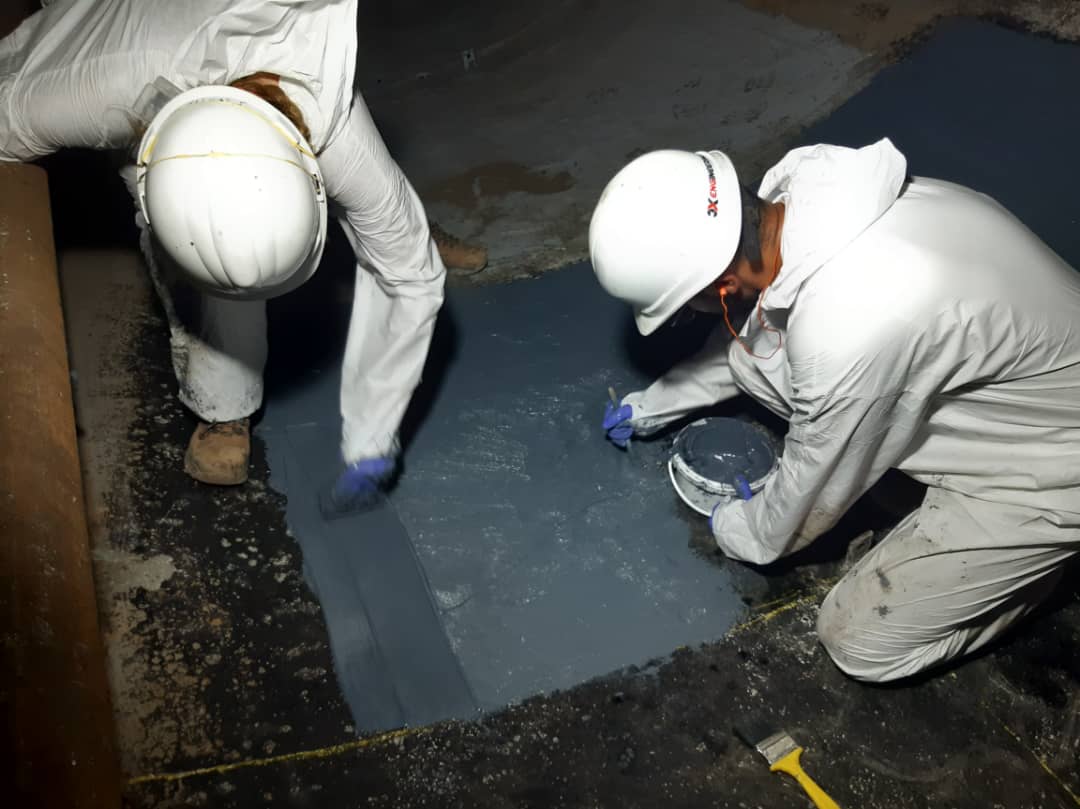 2. Filler and resin application: 3X filler with high mechanical properties and chemical resistance was firstly applied on all delimited areas to reshape them. Then one layer of 3X specific resin was applied over the filler to protect the surface before patching.