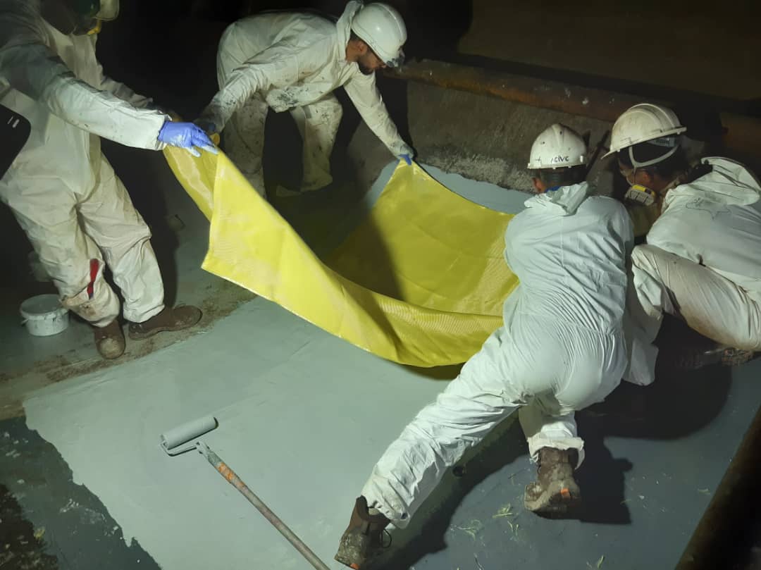 3. Composite patching reinforcement: Kevlar® patches impregnated with R3X150 resin were applied on the 12 defected areas. Patching size was determined according to the defect (the smallest one measured 795x445mm and the largest one 1270x2073mm). Each patch was impregnated separately and superimposed one after the others.