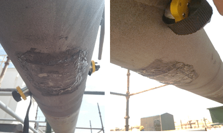 Calculations using 3X software were performed to define the minimum thickness and length necessary to give back the full integrity of the pipe, (according to the design pressure and temperature). Following client’s request, it was decided to design the repair according to no standard, to reduce the number of layers. In these conditions, 3X advised to apply a minimum of 12 layers of REINFORCEKiT® 4D (specifically dedicated to high temperature) to reinforce the tee with through wall defect and 8 layers for the one suffering from internal corrosion.