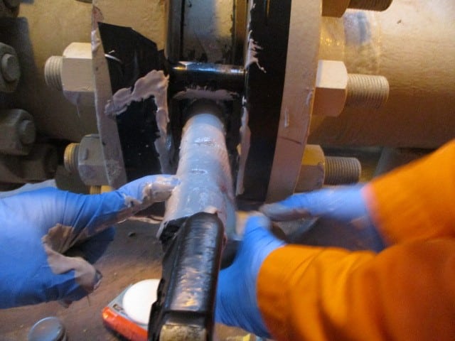 - Wrapping process to reinforce the defected area (previously covered with epoxy resin to ensure good wetting and impregnation of the tape) was completed using Kevlar® tape (specific size tape for small pipe diameter) impregnated with 3X high-temperature resin a total of 14 layers was applied for 180mm repair length.