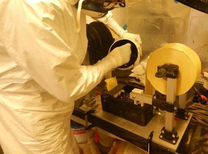 4. Composite wrapping. The wrapping process, using Kevlar® tape impregnated with 3X subsea resin (R4D-S), was performed either with the Tape Wrapping Machine (TWM) or manually by the divers depending on defect location. For straight repairs the TWM was used. For the repairs located on tee, the manual wrapping was preferable. In both ways, Kevlar® tape was wrapped helicoidally around the pipe with 50% covering. The impregnation of the Kevlar® tape with 3X subsea resin was made using BOBiPREG® machine (specific machine designed by 3X that allows a quick and regular impregnation of the tape with the resin before application). The repair length of each defect varied between 780 to 2340mm for a total composite wrapping length of 6800mm.