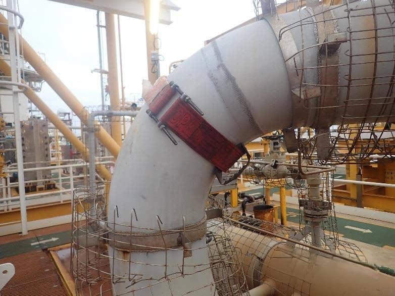 The objective of the repairs, performed early October 2023 by our client was to seal online 2 leakages on a 14 pipe transporting produced water located on FPSO. To carry out these emergency repairs, the client decided to use 3X emergency leak sealing system STOPKiT® Offshore, he had in stock. The client was previously trained to install this product.