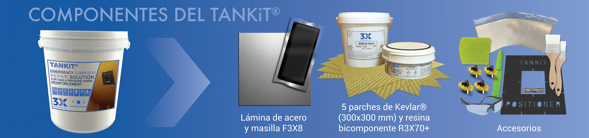 TANKiT® es un producto multicapa que incluye una placa de acero soldada en frío y patches de Kevlar® impregnados con una resina específica de 3X. No se requiere la suspención de las operaciones a excepción de presencia de fuga.