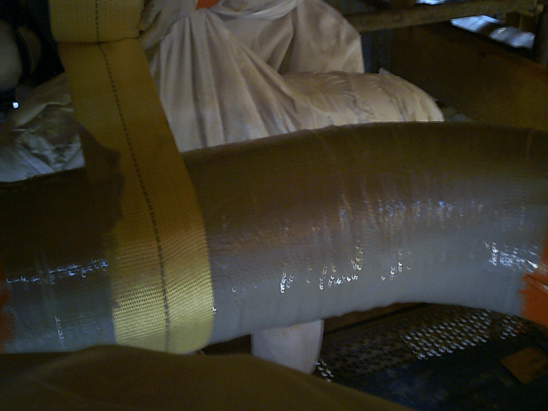 In accordance with ASME PCC-2 standard, the repair procedure specified the application of 4 layers of R4D (Kevlar® tape impregnated with a bi-component epoxy resin) for areas affected by metal loss due to corrosion and 10 layers of R4D for locations presenting through-wall defects. To ensure optimal adhesion of the composite material, the pipe surface was prepared using Bristle Blaster® machine, achieving a cleanliness level equivalent to St3/SA 2.5 and a surface roughness greater than 60 µm (Rz), verified with a calibrated roughness tester. Following confirmation of appropriate hygrometric conditions, the surface was degreased with acetone prior to the composite application.