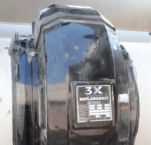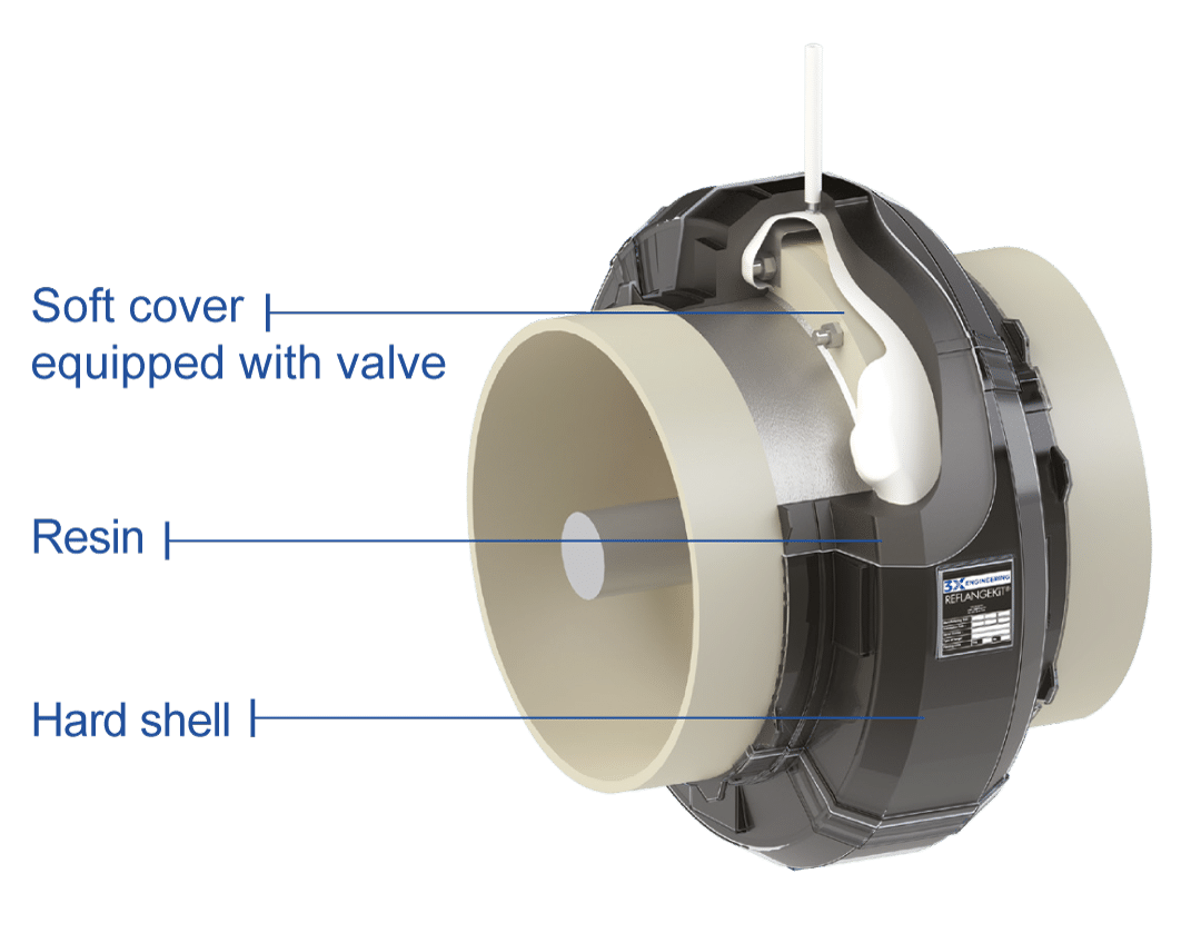 REFLANGEKiT® concept is based on a double shell system that encapsulates the leaking flange. The first shell made in PVC will cover and protect the flange and collect SF6 leaks. The second shell made in PET will contain 3X specific resin. An exhaust valve allows the gas getting out during resin injection. After overnight curing of resin, the valve is closed and sealed.